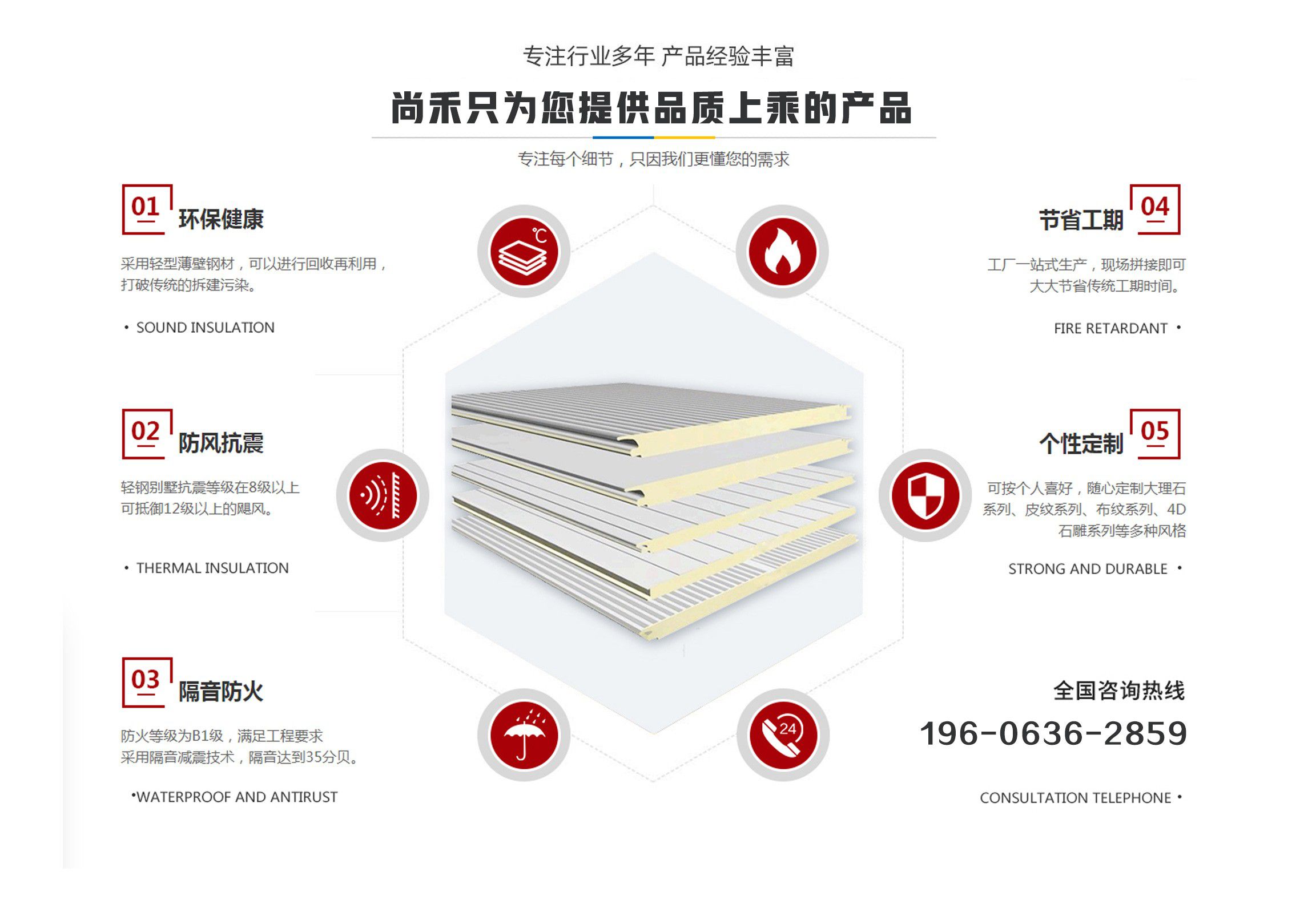 山東尚禾經貿有限公司是集板材設計、研發、生產、施工、一體化的科技公司,并在同行業中率先通過了質量、環境、安全管理體系認證。公司2011年投入資金2000余萬元引進世界先進的聚氨酯節能板連續生產線、意大利進口發泡系統,采用六組份在線自動操作混合澆注技術,在線一次性完成社會配料中心或工廠的配比混合工藝,并可以根據溫度在線自動調整,從而生產處與眾不同的高強度、節能型、綠色環保的聚氨酯夾芯板。(其使用年限高于同行業其他品牌5-10年) 公司主要經營范圍包括聚氨酯夾芯板,PU夾芯板,冷庫板,潔凈板,聚氨酯冷庫板,冷庫保溫板的設計、生產、銷售、技術指導、安裝及一體、以及進出口業務,是中部六省最大的綠色節能建材生產基地。聚氨酯夾芯板年產200萬平方米、PU夾芯板、冷庫保溫板500萬平方米、鏈整產業綜合實力,開創了六省至中西部創新型中小名企總部基地,并將著力推進中國中西部地區集成房屋住宅產業化發展進程?! 】萍紕撔?、節能典范。千萬間始終秉承“誠信、合作”的企業文化精髓,長期致力于鋼板材結構節能建筑產業,愿與社會各界攜手合作,共鑄綠色、環保美好未來。 產品具有良好的絕熱、阻燃、隔音、環保、耐久性能,可廣泛應用于工業、商用建筑內外墻、以及民用建筑外墻保溫、空調通風系統、專用防火保溫門等領域。 我們始終秉承...